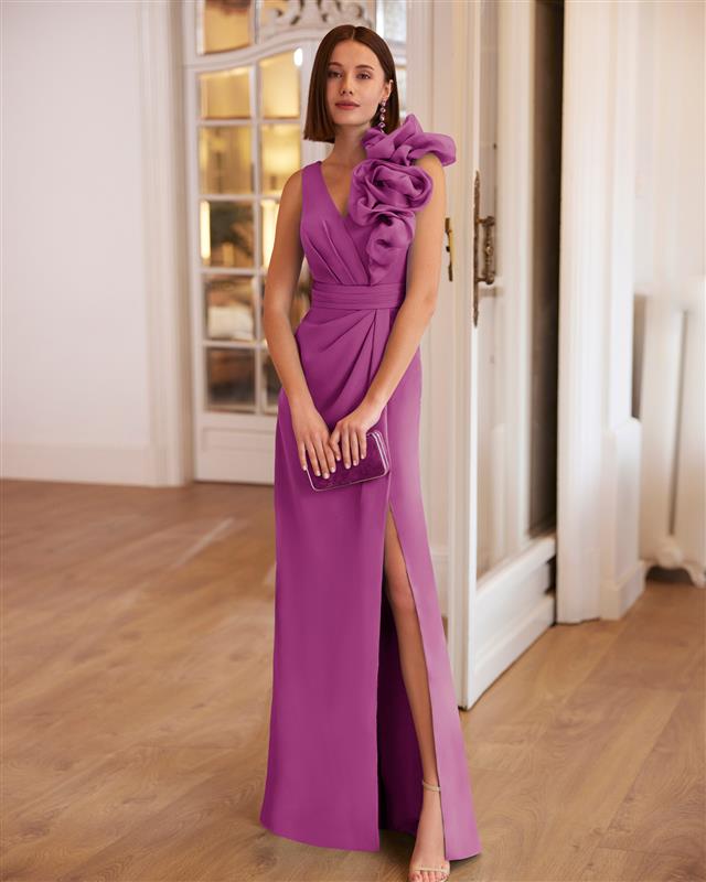 Elegant long guest dress crafted in crêpe. Featuring a V-neckline, V-back, side slit and a shawl. A Marfil Barcelona design.