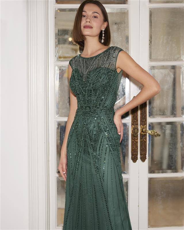 Long evening dress crafted in beadwork. Featuring a bateau neckline, back zip and sleeveless bodice. A Marfil Barcelona look.
